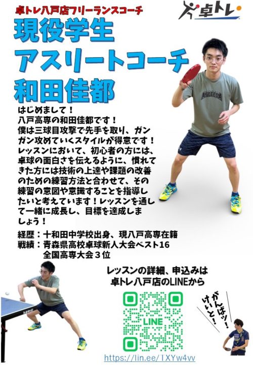 和田コーチのレッスンは、卓トレ八戸店の公式LINEにて承っております。